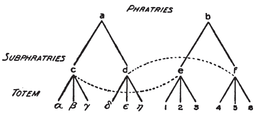 The twelve totem groups are brought under four subclasses and two main classes. All the divisions are exogamous'[15]. The subclass c forms an exogamous unit with e, and the subclass d with f. The success or the tendency of these arrangements is quite obvious; they serve as a further restriction on the marriage choice and on sexual freedom. If there were only these' twelve totem groups—assuming the same number of people in each group—every member of a group would have 11/12 of all the women of the tribe to choose from. The existence of the two phratries reduces this number to 6/12 or ½; a man of the totem α can only marry a woman from the groups 1 to 6. With the introduction of the two subclassess the selection sinks to 3/12 or ¼; a man of the totem α must limit his marriage choice to a woman of the totems 4, 5, 6.